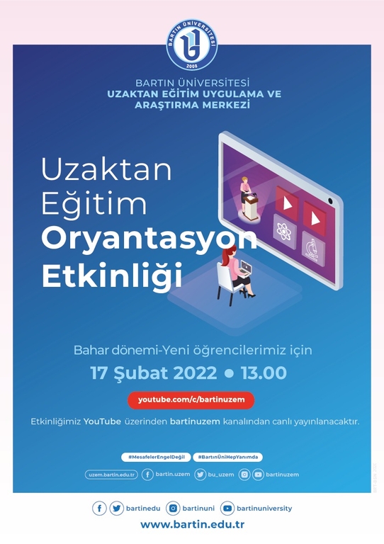 2021-2022 akademik yılı bahar dönemiiçin 17 Şubat 2022 tarihinde saat 13:00’da Üniversitemize yeni kayıt yaptıran 1.sınıf öğrencilerineYouTube üzerinden 'bartinuzem' kanalından; 11.00’da ise ilk defa uzaktan eğitimde ders verecek eğitmenlerimize Zoom Meeting üzerinden oryantasyon etkinliği yapılacaktır.